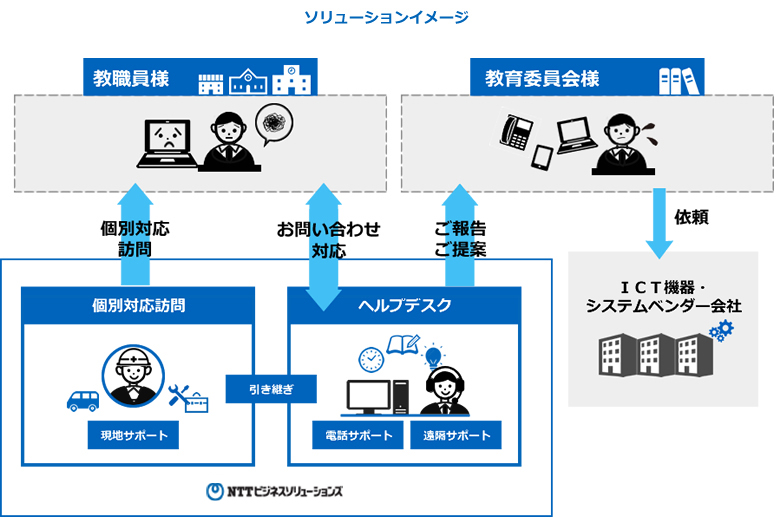 教育委員会に代わり学校からのICTに関する問い合わせをすべてNTTビジネスソリューションズ社のヘルプデスクで対応。