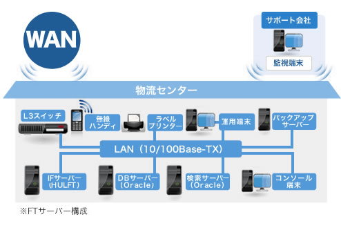 DBサーバー:1台(Express5800/120Rh-2) 検索サーバー:1台(Proliant ML310) IFサーバー:1台(Express5800/120Rh-2) ハンディサーバー:6台 レーザープリンター:30台 ハンディターミナル:100台 クライアントPC:30台 |
