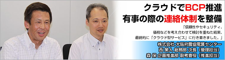 BCP対策の一環として、「AQStage 緊急通報サービス」を低コストで導入したJA大阪電算様。クラウド型サービスの今後の利用について、森 副考査役は「費用対効果とセキュリティ面のさらなる充実を考慮すれば、確実に選択肢の中に入ってくるでしょう。金融系のシステムには慎重にならざるを得ませんが、利用シーンに合わせたさまざまな活用を検討する意義は大いにあると思っていますので、今後も幅広い提案をお願いしたい」と、NTT西日本グループへの期待を語っている。