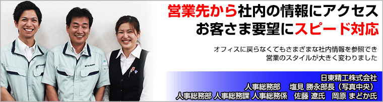 例えば、外出先から社内のメールや各種ファイルを確認できるようになれば、オフィスに戻らなくても済み、お客さまに対してスピード感のある対応をすることが可能となる。そこで日東精工様は、モバイル端末を通じて外出先から社内の情報にアクセスできる環境を整備するための検討を開始した。