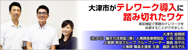 大津市様はテレワーク導入のためのICT環境を「リモートデスクトップ方式」によって構築。2018年12月から10の所属でモバイルワークを開始した。モバイルワークにより、メールを確認するためにわざわざ帰庁する必要もなくなった他、新幹線の車内でもアクセスできるため、出張の移動時間も有効活用できるようになったという。アンケートでは、利用者全員が業務の効率化を実感していると回答した。