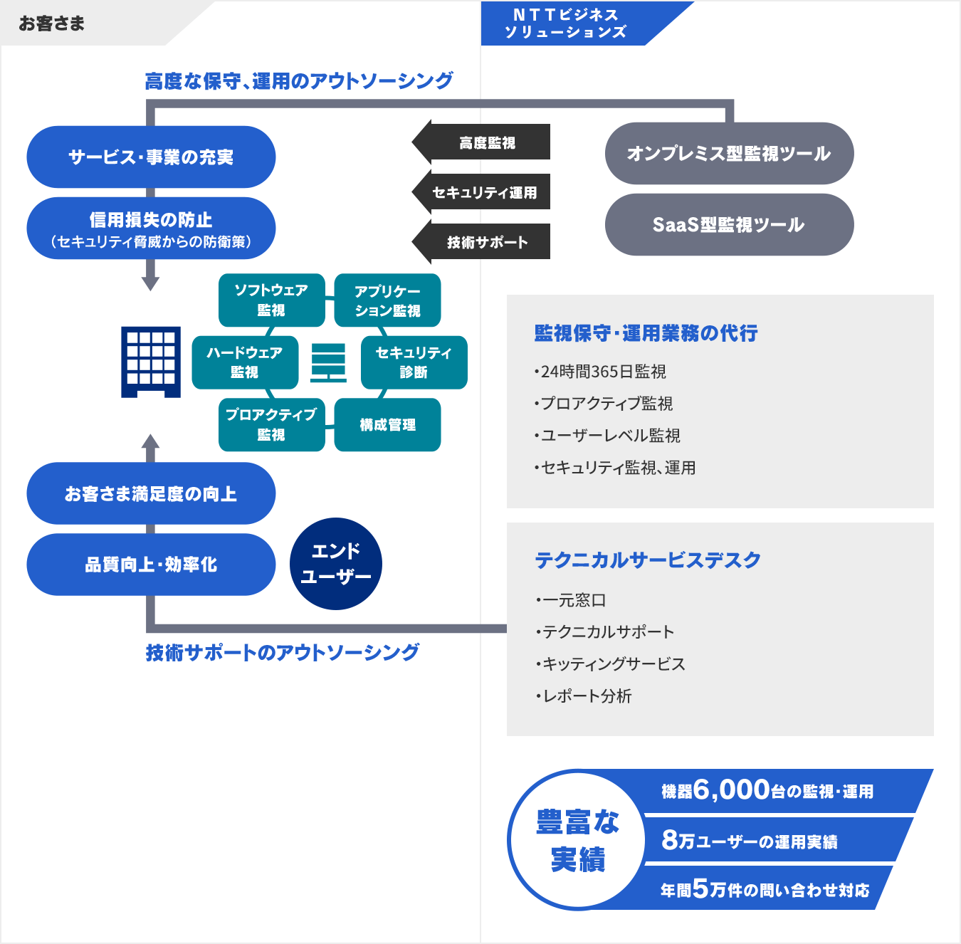 24時間365日の一元的なITマネジメントサービスを提供いたします。お客さまの負荷は軽減され、本来の業務に専念することが可能となります。