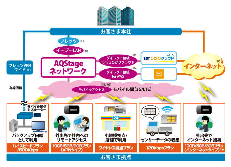 AQStage ネットワークにはVPNタイプとインターネットタイプがあり、24時間365日の保守受付体制で安心してご利用いただけます。