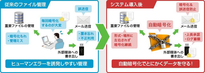 社内の電子ファイルを特別な操作なしに自動で暗号化することで、従来人の手で行っていたファイル選別や暗号化の手間を省くと同時に、暗号化忘れやパスワードの付け忘れを防止し、さらに外部持ち出しや添付メール送信時の管理運用ルールを徹底でき、ヒューマンエラーによる情報漏えいを防止します。