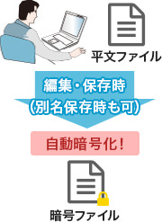 作成、編集したファイルは自動で暗号化されるため、暗号化の設定もれによるリスクを低減。万一の情報漏えい時でも、第三者による解読は困難です。