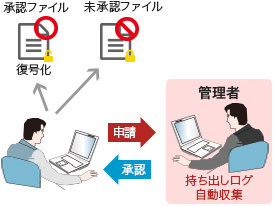 外部へファイルを持ち出す場合は、管理者の承認を得ることで、暗号化ファイルを自動で暗号化解除し、持ち出し管理簿を自動生成することで、適切な管理業務を実施できます。