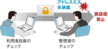 - 事前に指定された第三者(管理者等)による添付ファイル、送信先、送信内容のチェックと添付ファイルの承認により、メール送信時のうっかりミス(誤送信)を防止できるシステムをご提供