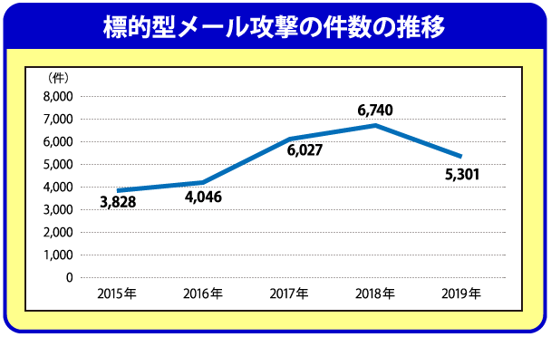 警察庁から公表された資料では、2019年中に報告を受けた標的型メール攻撃は、前年と比べ件数としては減少しているものの、攻撃手法は日々変化しているため、引き続き動向を注意しながら対策を講じる必要があります。