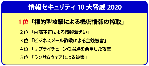 情報処理推進機構(IPA)が発表した「情報セキュリティー10大脅威2020」の「組織」向け脅威ランキングでは、標的型攻撃による被害が昨年に引き続き第1位に選出。