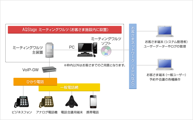 AQStage ミーティングワルツは、主装置とソフトで構成されます。 参加型会議だけの運用であれば、主装置と電話回線を接続するだけで実現できます。