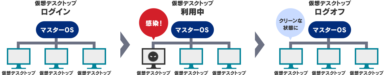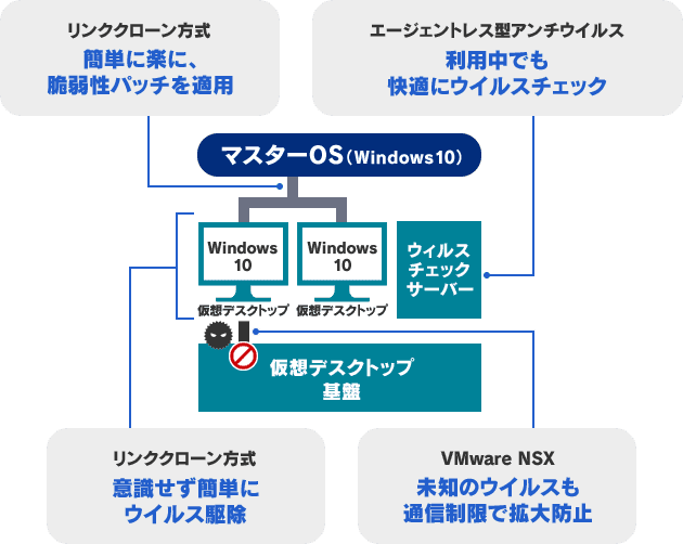 仮に、新しい未知のウイルス等に感染した場合でも、仮想デスクトップ間の通信制限により、その拡大を防止します。