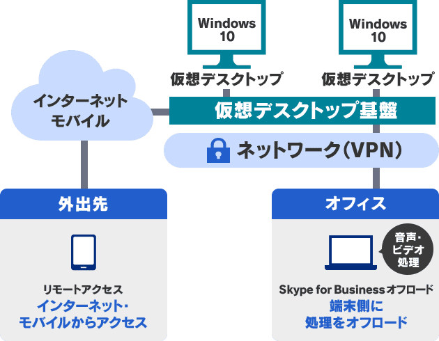 仮想デスクトップ上で「Skype for Business」をご利用する際、クライアント端末側に音声・ビデオ処理を オフロードします。