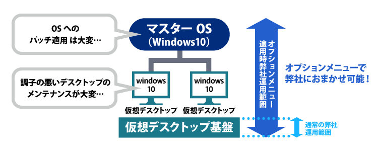 仮想デスクトップ故障時の対応、OSパッチ適用等を代行することで、お客さまの運用コスト・負荷を軽減します。