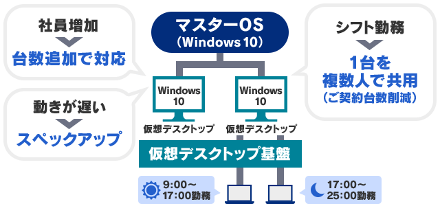 - 仮想デスクトップ1台を複数人で共用。ご契約台数削減可