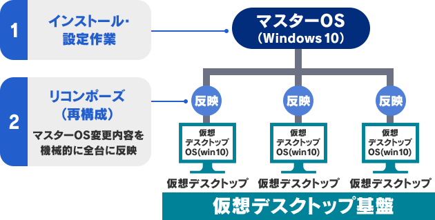 リンククローン方式は、1つの「マスターOS」に対して設定変更するだけで、それに紐づく全ての仮想デスクトップに対し、機械的に変更を反映することができます。