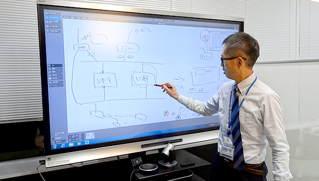 議論をしながら、資料を映したディスプレイに直接、アイデアを書き込んだり、提案内容や見積を双方で確認しながら詰めていく作業等に活用し、正確で臨場感のあるコミュニケーションを実現しています。