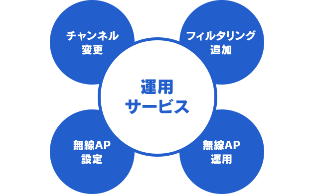 運用サービスではサービス開始後のチャネル変更、MACアドレスフィルタリングの追加など無線アクセスポイントの運用・設定をサポートします。