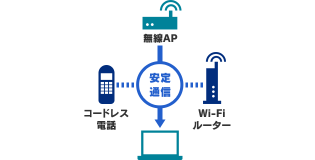 独自の干渉波フィルタリング機能により、コードレス電話機やモバイルWi-Fiルーターなどの電波干渉が発生しても通信を継続することが可能です。