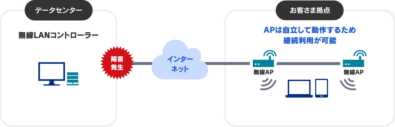 万一、データセンター側のサーバーがダウンして無線アクセスポイント~無線LANコントローラー間で通信が行えない場合でも、無線アクセスポイントは自立して動作を継続し、無線LANの利用が可能です。