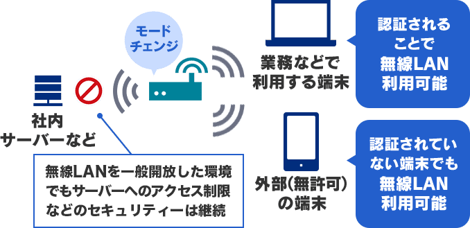 災害発生時等には認証なしの運用モードに切り替えることで誰でも無線LANを利用することができます。