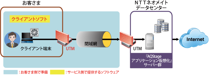 AQStageアプリケーション仮想化は、NTTビジネスソリューションズのデータセンター上に、仮想化したブラウザーをご用意し、お客さまのご利用端末に配信します。