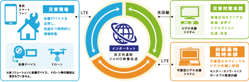 災害現場の状況をフルHDによる映像音声で、リアルタイムに共有することで、現場で起こっている事象を遠隔地で把握可能。