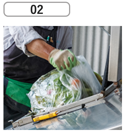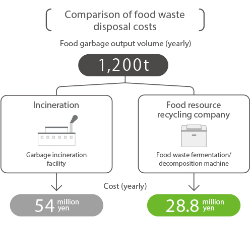 Vegetables and other food waste are fed into the food waste fermentation/decomposition machine. This makes it possible to reduce food waste bulk and the cost of waste disposal.