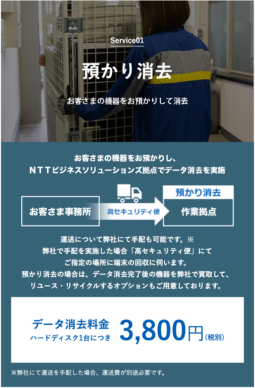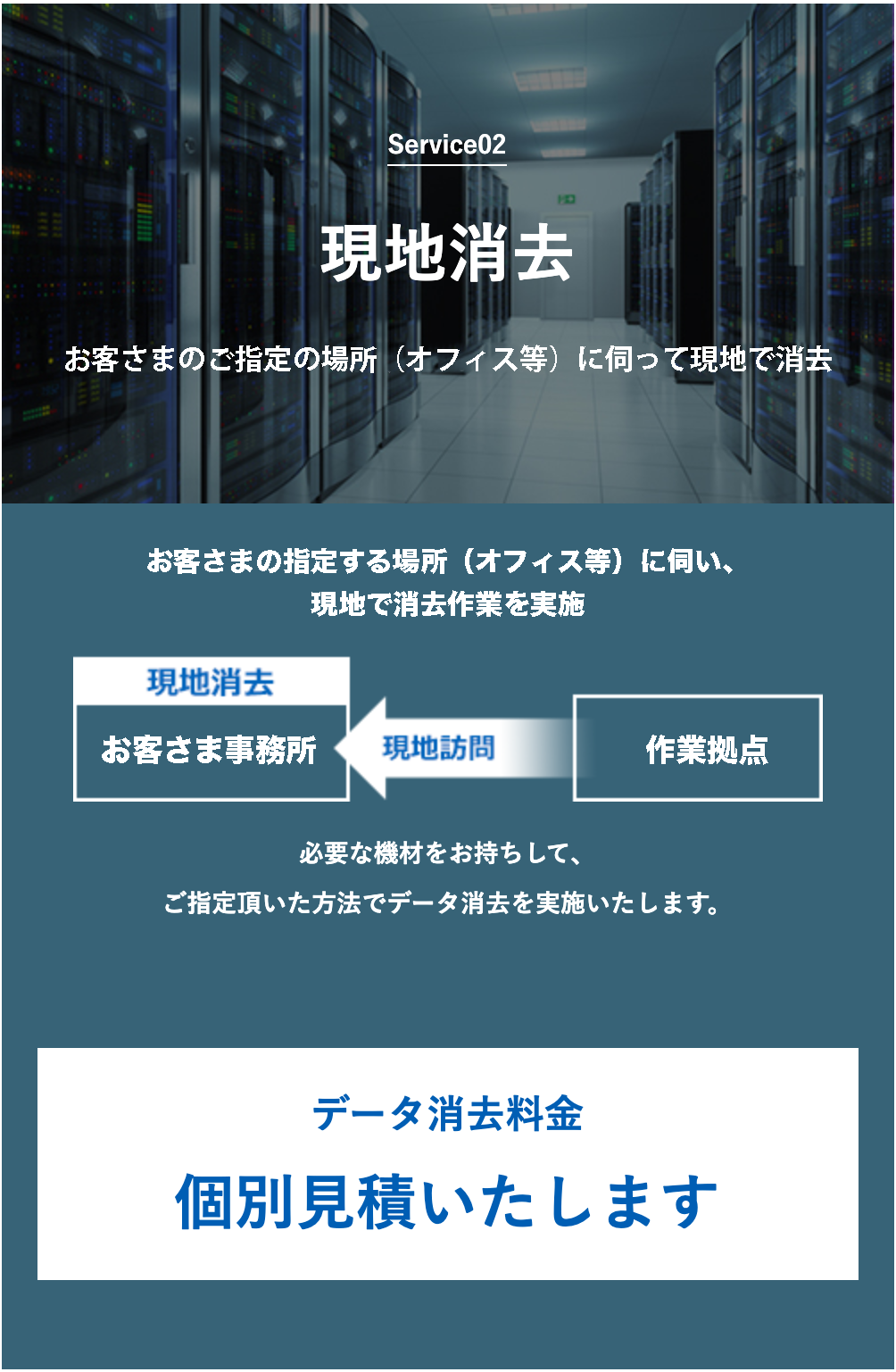 機器をお預かりして消去する「預かり消去」と、 お客さまのご指定の場所に伺って現地で消去する「現地消去」の、 2つのサービスメニューをご用意しています。