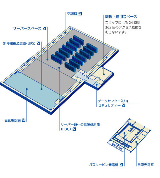 災害時にも機能を維持する事が求められるデータセンターのファシリティーとして、免震構造を採用するとともに、自家発電設備や無停電電源装置、空調機等の主要機器には冗長化・二重化を図り、災害時、主要機器の故障時、メンテナンス時においても機能を維持・持続できる環境を実現しました。